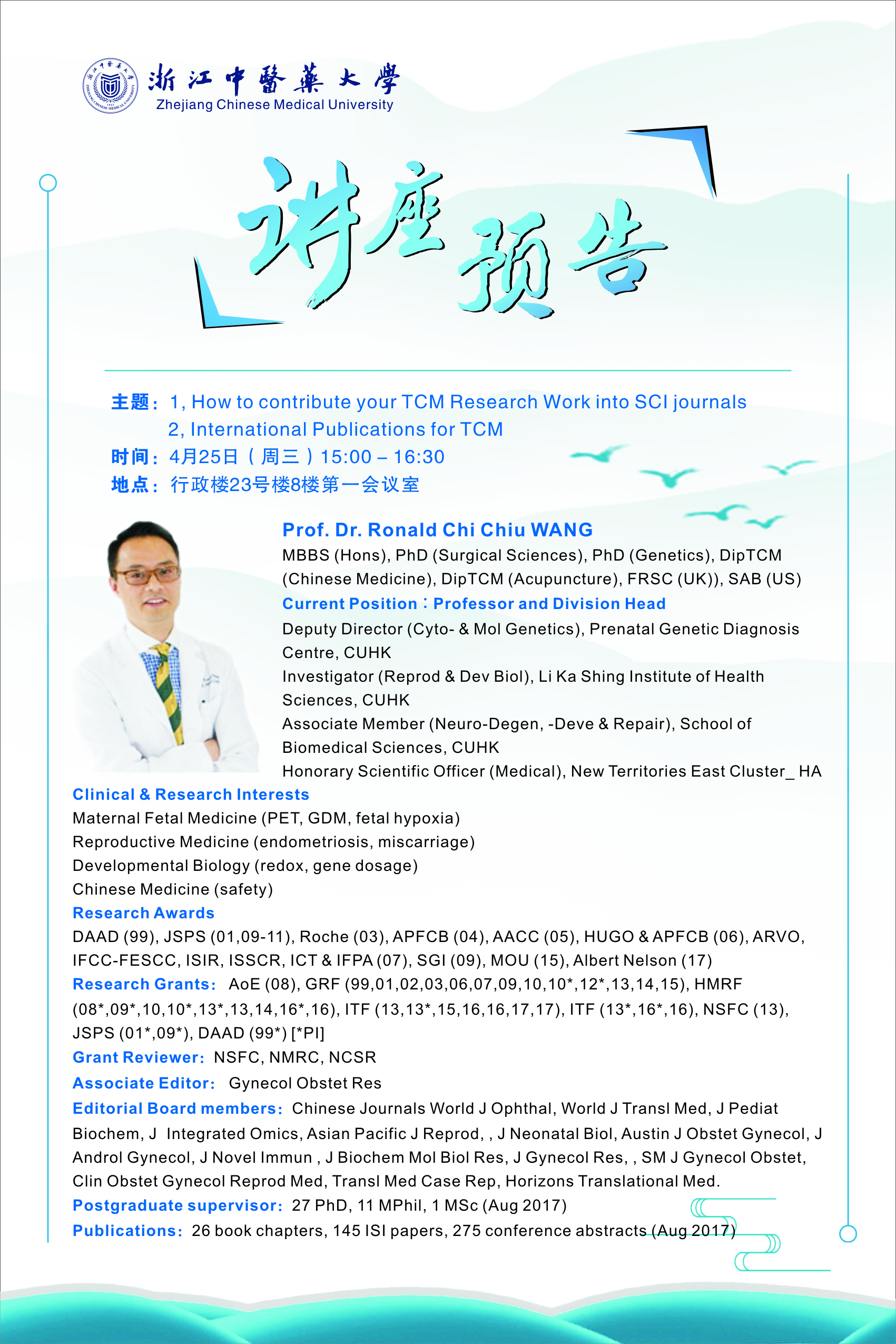 讲座预告:1.如何发表中医类SCI论文 2. 中医国际发表